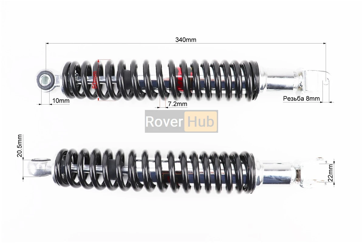 Амортизатор задній GY6 - 340мм*d50мм (втулка 10мм / вилка 8мм), чорний к-кт 2шт