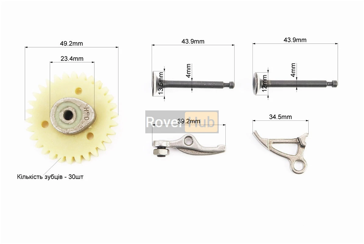 Клапан впускний (h-43,9; D-13,5; d-4), випускний (h-43,9; D-12; d-4) к-кт 139F - 4Т + шестерня розподільного вала + коромисла к-кт