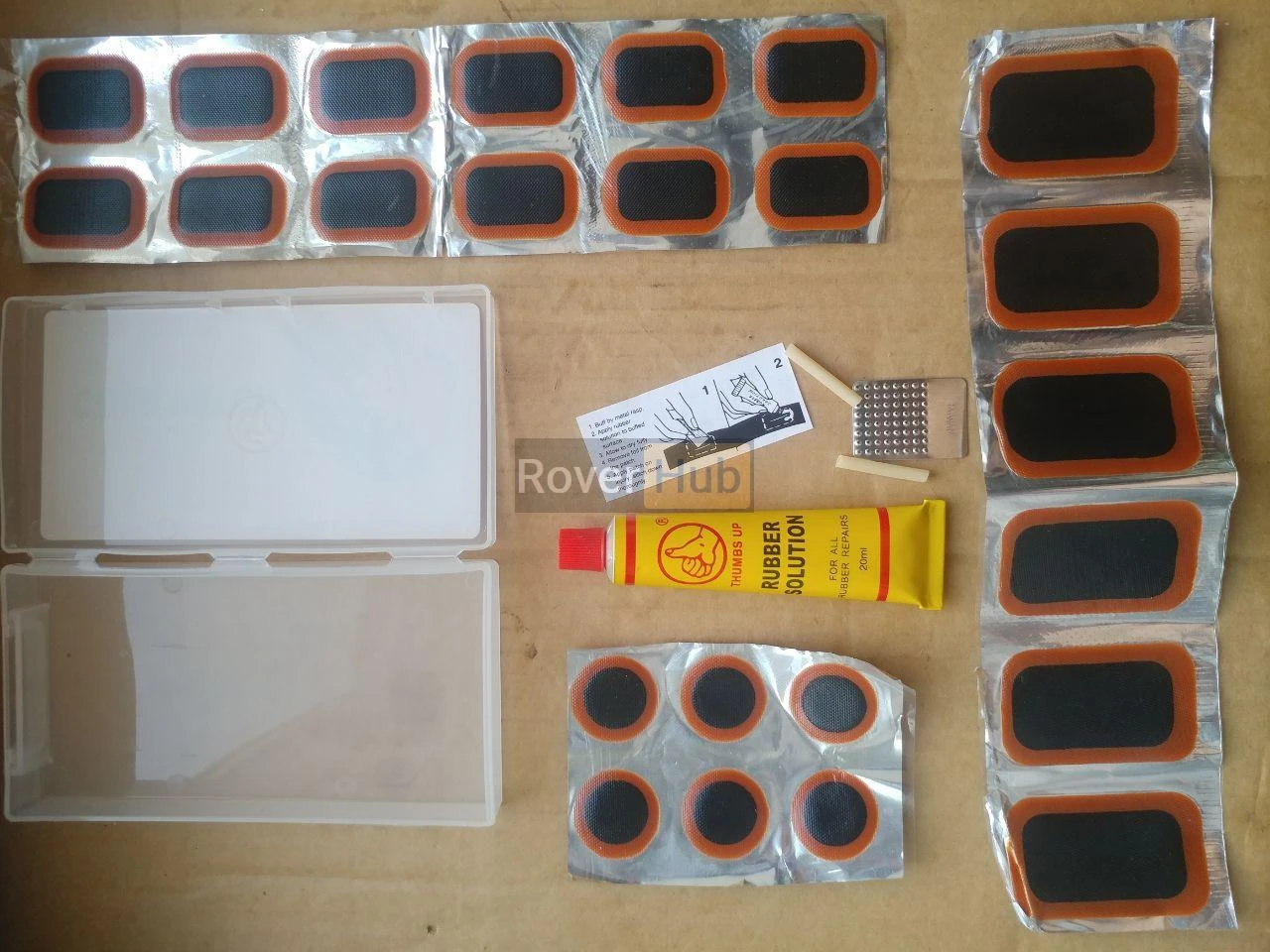 Комплектность: латки 24 штуки разных размеров (24x35 мм-12 шт, 25 мм-6 шт, 32x50 мм-6 шт.), железная зачистка, клей 20 мл, инструкция.