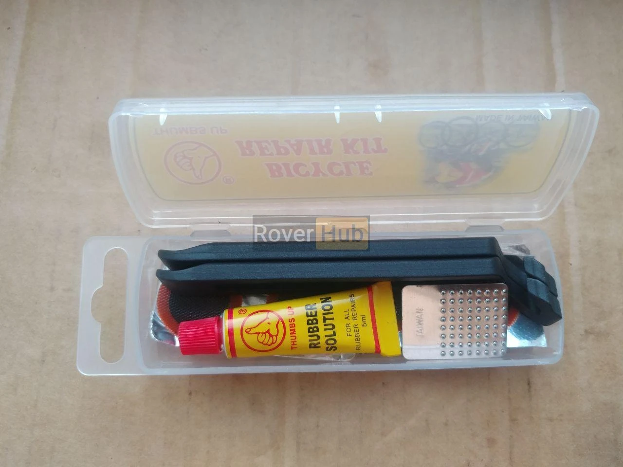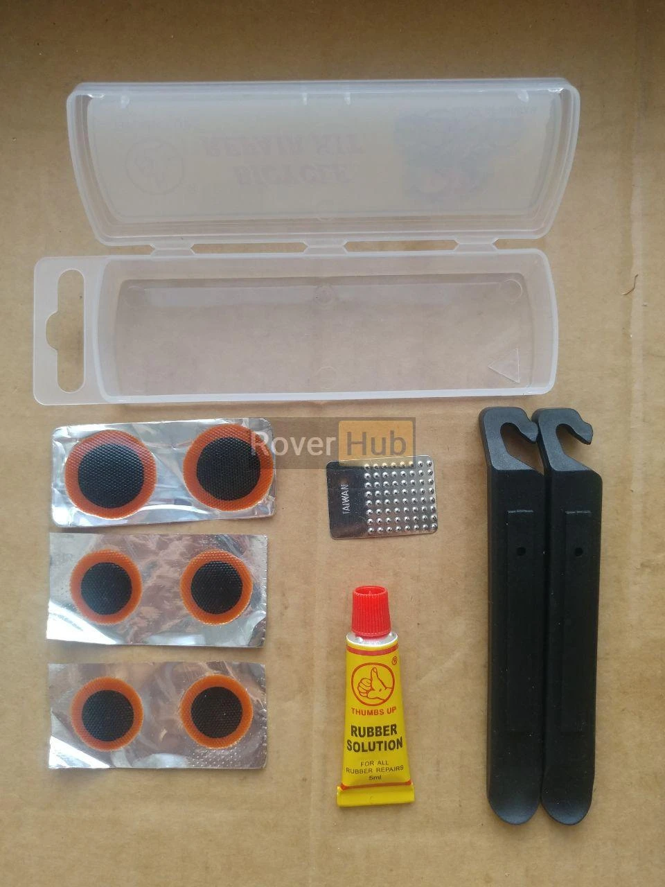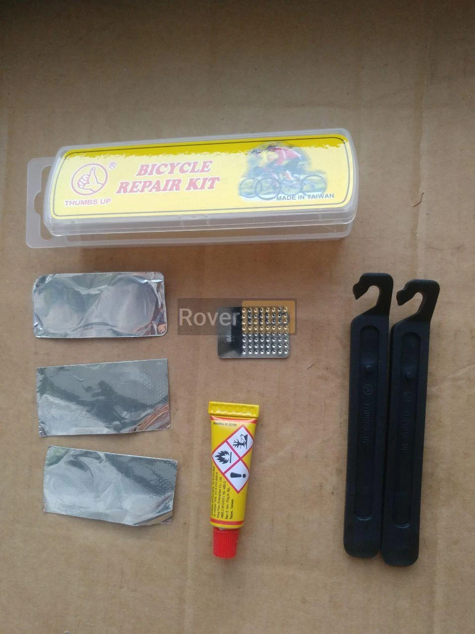 Комплектність: 6 латок, клей 5 мл, шліфувальна залізна пластина, 2 бортувальні лопатки.